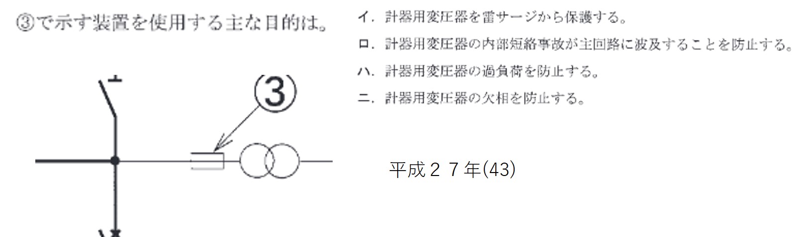 | (3) | ロ | 計器用変圧器の一次側に施設する限流ヒューズは変圧器内部の短絡事故が主回路に波及することを防ぐ役割がある。 | |