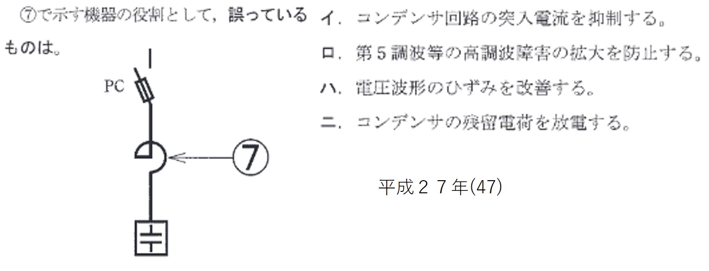 | (4) | 二 | ➆で示す機器は直列リアクトルであり、高調波を抑制する働きがある。 |