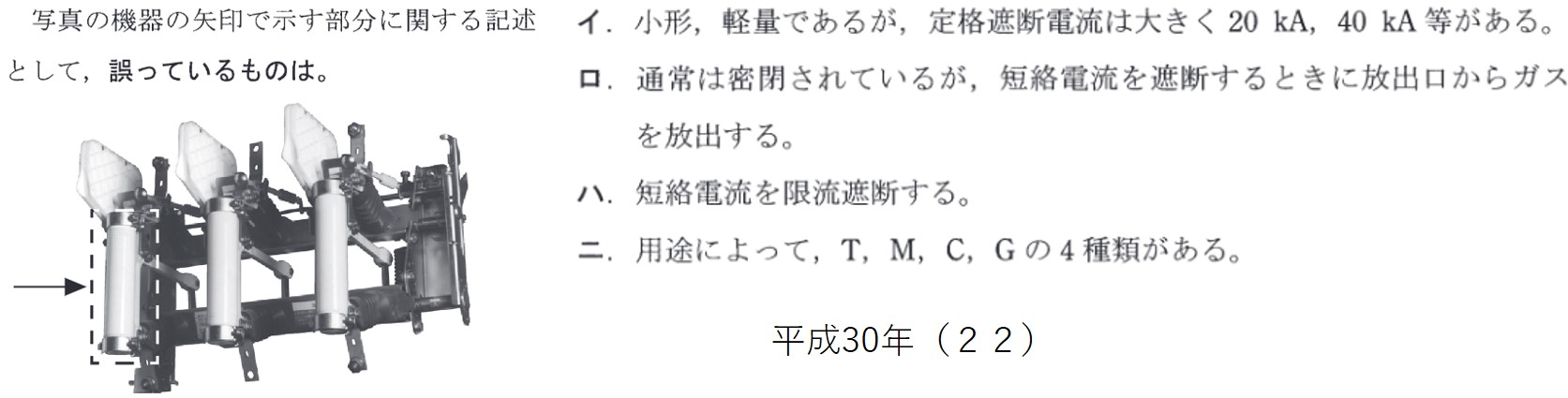 | (1) | ロ | LBSに付属している限流ヒューズは完全に密閉されているため、ヒューズが溶断してもガスが漏れることはない。 | |