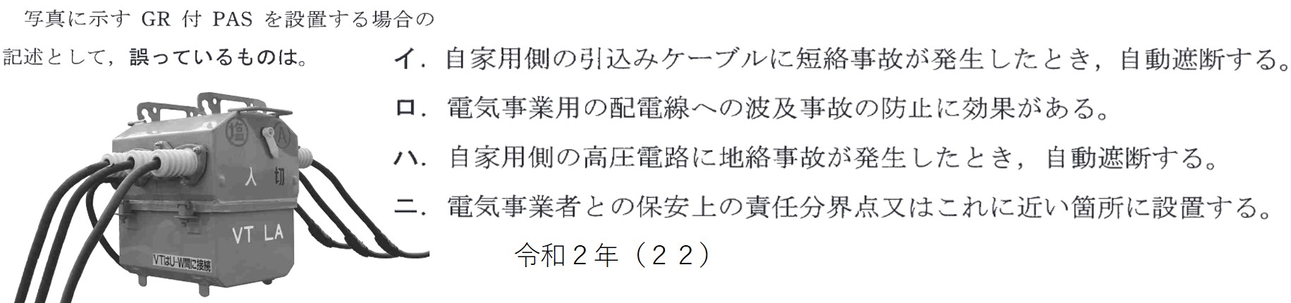 | (1) | イ | GR付PASは短絡事故が発生した時にSOG動作を行うため、自動遮断は行わない。 | |