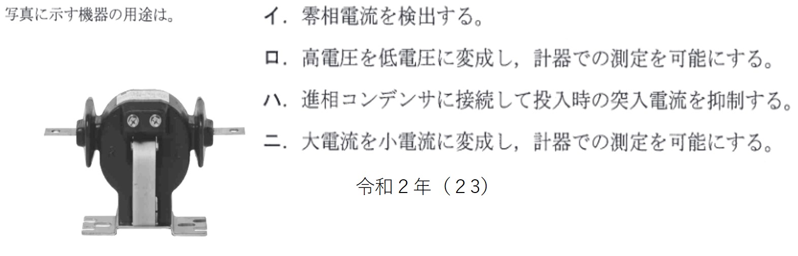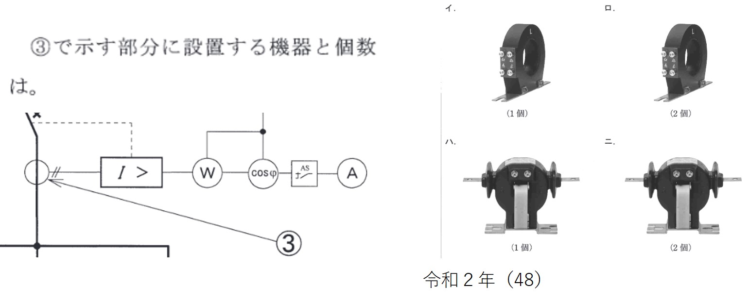 | (4) | 二 | ➂に示す機器は変流器であり、大電流を小電流に変流する。 |