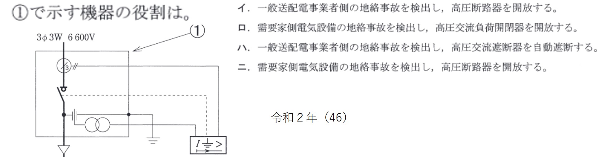 | (3) | ロ | 地絡方向継電器付き高圧交流負荷開閉器は地絡事故を検出したときに回路を自動遮断する。 | |