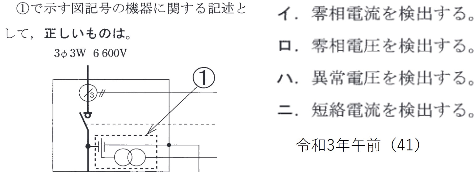 | (2) | ロ | ➀の機器は零相基準入力装置であり、地絡発生時の零相電圧を検出する。 | ➅|