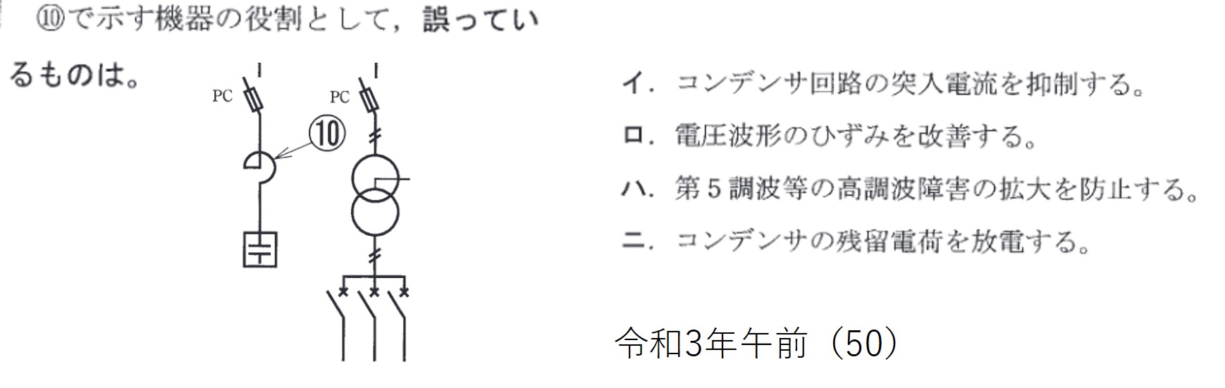 | (4) | 二 | 直列リアクトルは第5高調波の高調波障害の拡大を防止する役割がある。 |