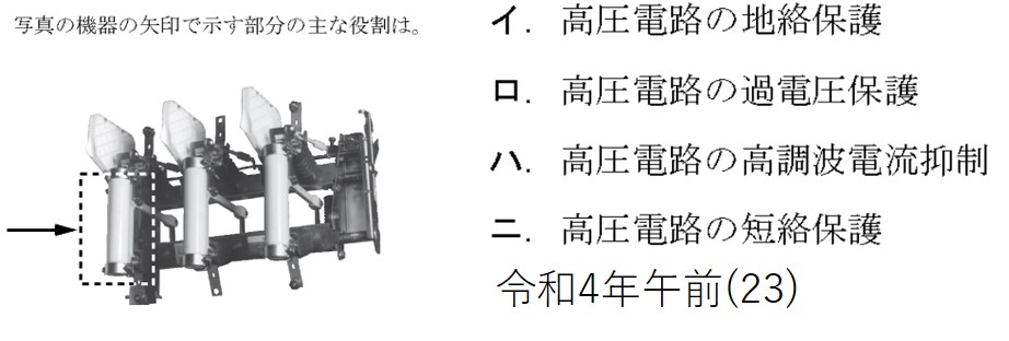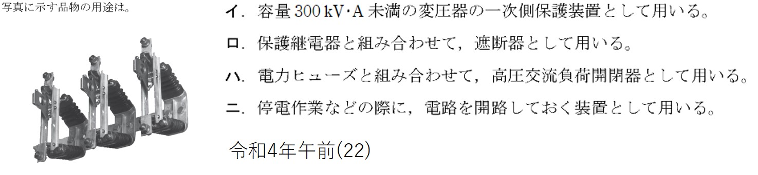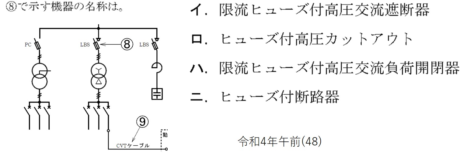 | (4) | ハ | 限流ヒューズ付き高圧交流遮断器はLBSという略字で表される。 |