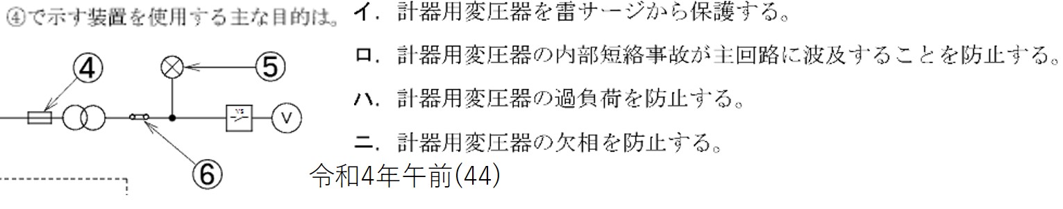 | (3) | ロ | 計器用変圧器に接続してある限流ヒューズは計器用変圧器内部の短絡事故が主回路に波及することを防止する役割がある。 | |
