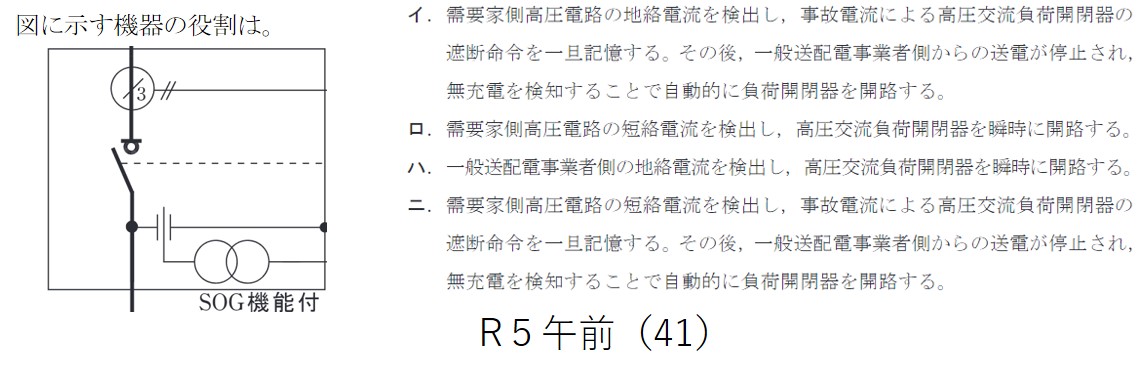 | (3) | 二 | 地絡継電器付高圧交流負荷開閉器は(GR付きPAS)は、短絡事故の発生時に、SOG動作を行う。SOG動作とは、短絡電流が流れた場合、過電流素子が働いて、開閉器をロックする。その後、一次側の充電が無くなるとと自動で開路する動作である。 | |
