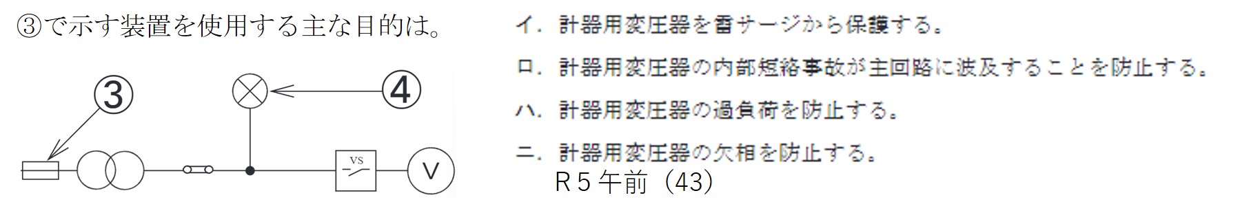 | (4) | ロ | 計器用変圧器の一次側に設置されている限流ヒューズは、内部での短絡事故を主回路に波及させないために施設している。 | |