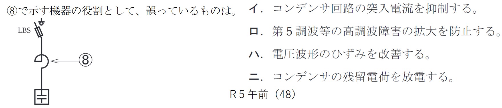 | (5) | 二 | ➇に示す機器は直列リアクトルであるため、第5高調波やコンデンサへの突入電流が流れることを抑制し、電圧波形のひずみを改善する働きがある。 |