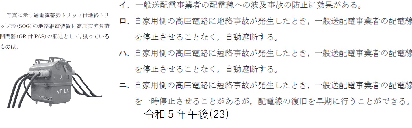 | (2) | ハ | 地絡継電器付高圧交流負荷開閉器は(GR付きPAS)は、短絡事故の発生時に、SOG動作を行う。SOG動作とは、短絡電流が流れた場合、過電流素子が働いて、開閉器をロックする。その後、一次側の充電が無くなるとと自動で開路する動作である。 | |