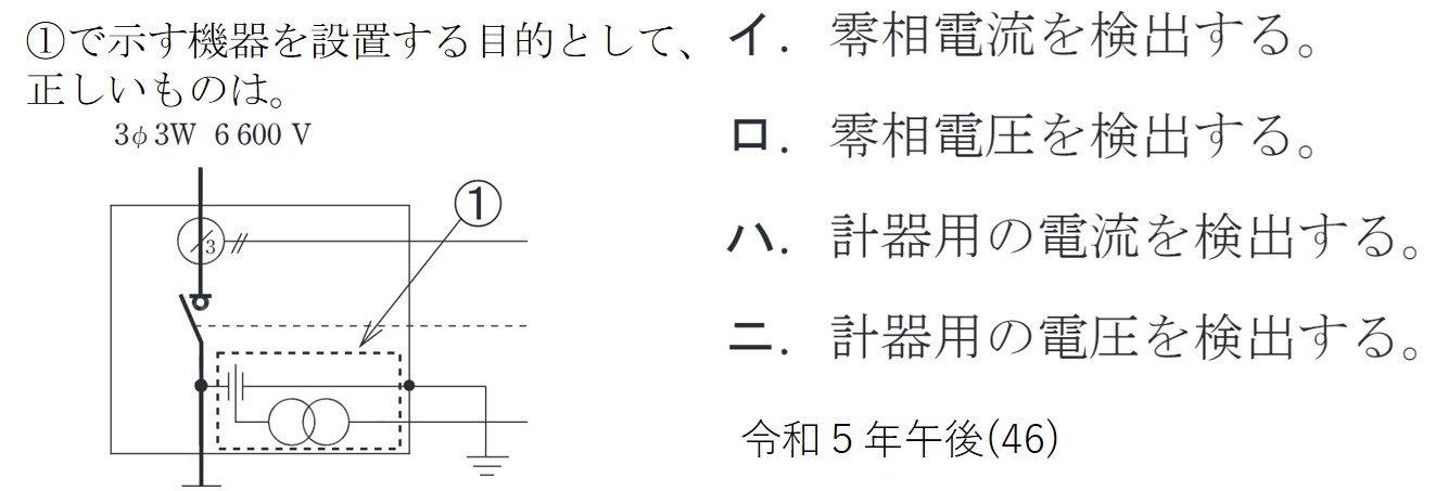 | (3) | ロ | 零相基準入力装置(ZPD)は地絡事故が発生したときの零相電圧を検出する。 | |